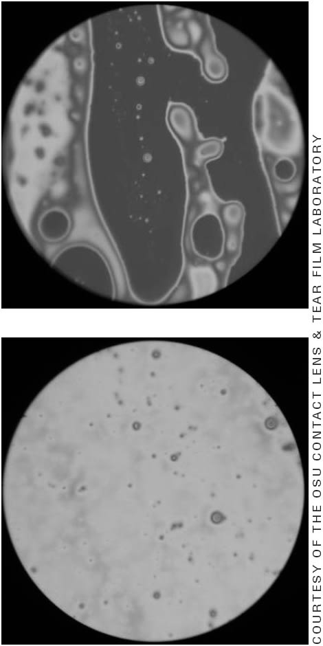 An obstructive form of MGD is associated with skin disease. It is characterized by abnormal or hyperkeratinization of the meibomian gland ducts and is a probable precursor to inflammation (Bron, 2004; Driver, 1996). Obstruction of the duct leads to reduced meibum in the tear film, resulting in dry eye from increased tear evaporation. Figure 3 shows images of the tear film lipid layer using a microscopy procedure. In addition, lipid production is reduced in the gland itself as a likely result of meibomian gland atrophy. Figure 4 shows the appearance through meibography of both partial and entire meibomian gland loss in patients who have MGD.
