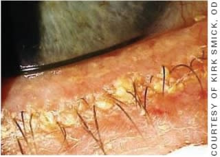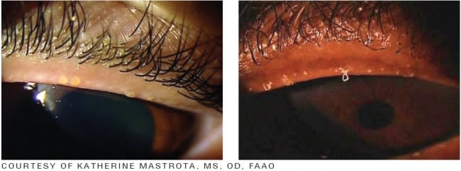 In addition to posterior lid margin inflammation and thickening, hypersecretion or hyposecretion, and cloudy, granular, or toothpaste-like secretion (Figure 2 [right image]) upon expression, other clinical signs of posterior blepharitis include conjunctival hyperemia, chalazion formation, and concurrent facial rosacea (Lemp and Nichols, 2009). Chalazia frequently occur with MGD and are believed to arise from meibomian gland obstruction and resultant accumulation of lipid within the gland. Dougherty (1991) identified significant changes in these products by noting an increase in monounsaturated, longchain fatty acids. Smaller amounts of diand triesters, triglyceride, fatty acids, and free sterols also exist in these secretions. Alterations in meibum composition result in an increased melting point and viscosity of the meibum, which, in turn, negatively affects tear film stability. All of these factors play a crucial role in MGD development.