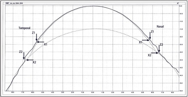 Both the limbus and the anterior sclera show the same pattern, but in the limbal area (10.00mm to 15.00mm) these differences are relatively small, although with 100 microns in magnitude these differences within one eye could still have clinical significance. For the scleral shape (15.00mm to 20.00mm) though, the differences are in the 400 micron range within one eye and surely are clinically relevant.
