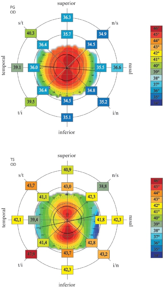 Figure 5a and 5b. Examples of the right eye of two normal subjects with their limbal and scleral angles in eight directions with a very flat appearance (PG) and a very steep appearance (TS), both with their corneal topography images superimposed.