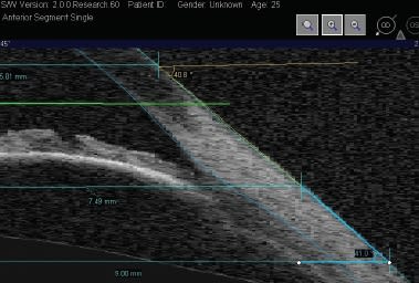 Figure 6. Example of a tangential limbal and anterior scleral shape OCT image, with a 41 degree limbal and scleral angle (steep profile) in the 225 degree direction.