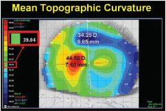 In cases in which a wide range of asymmetrical curvatures are present throughout the cornea, we select the base curve of the initial diagnostic lens by a technique we call “mean topographic curvature.” In this technique we use the normalized scale of the axial map to identify topographical endpoints of the given cornea, with the steepest portion of the cornea represented in red and the flattest in blue. The remaining 14 colors identify the curvatures that make up the rest of the cornea.