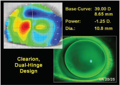 We performed a manifest refraction over the −3.00D diagnostic lens, resulting in a best-corrected VA of 20/25. The final lens had a 39.50D base curve, −1.25D, 10.8mm diameter. CLS