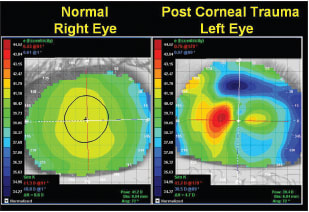 Figure 1. Corneal topography of the normal right eye and that of the traumatized left eye.