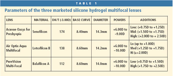 The PureVision Multi-Focal (Bausch + Lomb) was launched in 2006. The Air Optix Aqua Multifocal was launched in Europe in January 2009 and in the United States in early 2010. Acuvue Oasys for Presbyopia (Vistakon) was launched in the United States in May 2009. The major parameters of each of these lenses are listed in Table 1.