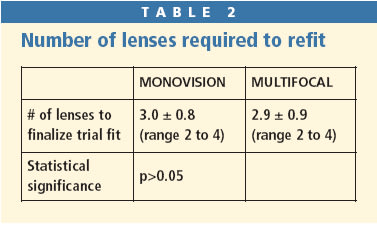 In a recent study by Woods et al (2009), 26 participants requiring their first presbyopic correction were fitted with both monovision and multifocal lenses following a refraction. The number of lenses required to achieve the “walk out of the door” week-long trial fitting was recorded. This number was believed to provide an insight into the chair time required to complete the fitting to this stage. Table 2 presents the results, which show there's no significant statistical or clinical difference in the fitting time between monovision and multifocal lenses. This result may have been influenced by the new lens design used in the study and also by the fact that the participants required a low reading addition.