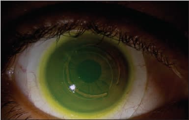 The peripheral circumferential corneal elevation above the ring segment inserts causes mechanical barriers when fitting rigid contact lenses (Figure 1). Although successful fits can be achieved, it is not without a significant number of diagnostic lenses and multiple design changes. For example, in the UCLA study up to seven diagnostic lenses were used before a final fit was achieved. In my practice, specialty GP lenses have always been employed after intracorneal ring inserts, either in a piggyback, semi-scleral, or hybrid design. Rarely can a small-diameter GP lens be used alone because of mechanical impingement and epithelial breakdown in the area immediately above the inserted segments. In the UCLA study, one of the three subjects was fit to a semi-scleral lens, as was the patient in Figure 2. These lenses work very well and have become the lens of choice after intracorneal ring segment implantation in my practice because they can vault the cornea, preventing impingement on the epithelium above the inserts and redistributing the pressure to the sclera. Of course, they correct residual ametropia and irregular astigmatism as well.