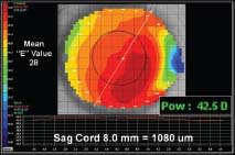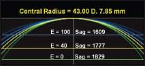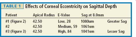 To further illustrate the effect of corneal eccentricity, we selected three corneas with identical apical radii of 42.50D (7.85mm) and measured their corneal sag over a cord of 8.0mm (Figures 2 and 3). Table 1 clearly shows that as the eccentricity increases, the sagittal depth decreases.