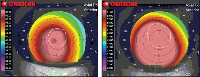 Figure 1a and b. Topography maps of a parent (left) and child (right) who have keratoconus.