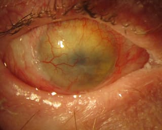 Figure 1 shows the right eye of a 54-year-old man with Stevens-Johnson syndrome (see Figure 2 for the left eye). His symptoms started at age 10. His best-corrected visual acuity is count fingers for the right eye and 20/40 for the left eye. He currently uses combination tobramycin and dexamethasone (Tobradex, Alcon Laboratories Inc.) twice per week in both eyes, ciprofloxacin (Ciloxan, Alcon Laboratories Inc.) twice per week in both eyes, loteprednol (Lotemax, Bausch + Lomb) every day in both eyes, and Refresh Tears (Allergan Inc.) in both eyes as needed. The patient has had surgeries to correct symblepharon and trichiasis. He has successfully worn scleral contact lenses for 5 years.