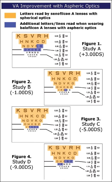 This series of studies has shown that balafilcon A lenses with aspheric optics significantly reduced spherical aberration and provided better VA over conventional optics: true points of differentiation when recommending contact lens products. CLS