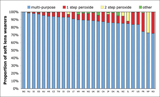 Extended wear soft lenses account for less than 10 percent of soft lens fits, although some markets (Norway and Lithuania) prescribe more than a quarter of soft lenses for this modality of wear. Multipurpose solutions account for 88 percent of all care systems prescribed for use with soft lenses (Figure 3). CLS