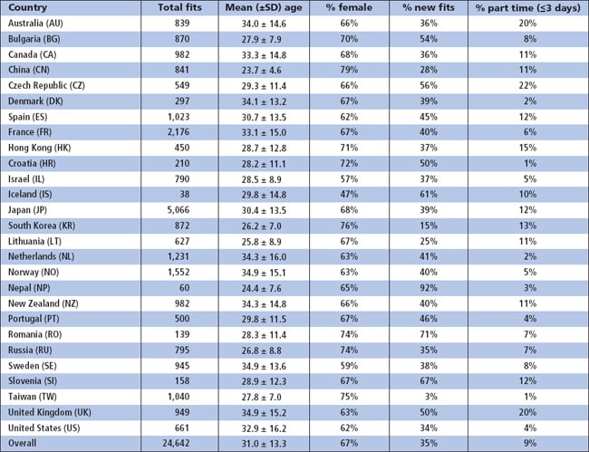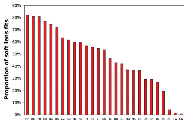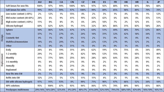 Our surveys typically find that about two-thirds of contact lens fits are to females, with an average age at fitting in the early 30s. This year was no exception. Sixty-seven percent of fits were to women, with individual markets ranging from 57 percent in Israel (excluding Iceland with its low return) to 79 percent in China (Table 1). The oldest patient receiving lenses for the first time was a 95-year-old female in Japan. She was prescribed high-water-content hydrogels for extended wear.