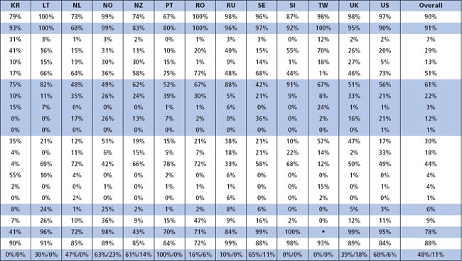 Overall, rigid lenses accounted for 9 percent of fits (Table 2 and Figure 1). Table 3 shows a detailed analysis for the 11 countries that provided information for 35 or more rigid lens patients. Rigid lens fitting remains strong in Japan, the Netherlands, New Zealand, and Portugal with a high proportion of orthokeratology fits in the latter three markets. On the other hand, some major markets have seen a significant reduction in rigid lens fitting in recent years including Australia (14 percent of fits in 2005 compared with 0 percent in 2010), Canada (8 percent versus 1 percent), and the United Kingdom (7 percent versus 4 percent).