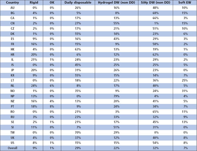 High-Dk lenses (>90 units) are the rigid lens of choice overall, accounting for 62 percent of fits. Most rigid lenses (65 percent) are prescribed on a planned replacement modality (usually annually); a significant amount of extended wear prescribing was reported for New Zealand and Portugal, mainly due to the popularity of orthokeratology outlined above.