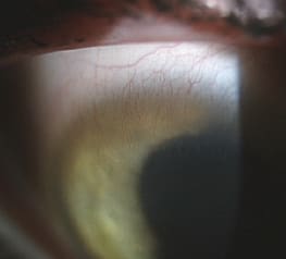 Impaired function of corneal epithelial stem cells/limbal architecture is responsible for corneal surface damage and is clinically characterized by a dull and irregular corneal reflex, recurrent epithelial defects, neovascularization, corneal opacity, and conjunctivalization. Conjunctivalized corneal surfaces stain “late” with fluorescein, as conjunctival epithelium is more permeable compared to corneal epithelium. In partial stem cell deficiency, a clear line of demarcation can sometimes be seen between the corneal and conjunctival phenotype of cells. Subjectively this is represented by mild ocular irritation or foreign body sensation, recurrent episodes of pain (epithelial breakdown), lacrimation, photophobia, redness, and reduced acuity. A recent case series of presumed contact lens-related LSCD suggests that focal LSCD can present with varying manifestations and that it may be more common than currently reported (Jeng et al, 2011). The authors included patients whose clinical presentation was suggestive of LSCD, that is as dull, opaque-appearing epithelium with a “streaming” appearance, sometimes associated with superficial vascularization, emanating from the limbus.