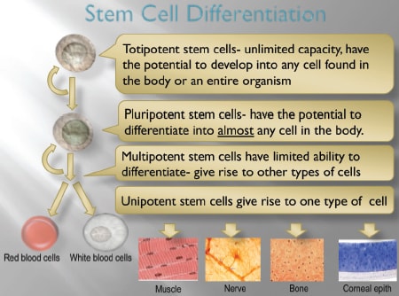 During the first few hours after a human egg is fertilized, it divides into multiple identical cells that are said to be totipotent (Figure 1). These cells have the capacity to form an entire organism. At approximately four days after fertilization, after several cycles of cell division, pluripotent cells can give rise to most, but not all, of the tissues essential for fetal development. Further division yields even more specialized cells, multipotent cells, that have a specific function. For instance, hematopoetic multipotent stem cells can give rise to leukocytes, erythrocytes, and platelets. Unipotent stem cells are cells in adult organisms that are capable of differentiating along only one lineage (producing one type of tissue) (Fuchs and Segre, 2000).