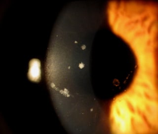 This photo shows the left cornea of a 27-year-old male who reported as a new patient for contact lens fitting. He reported no ocular or visual complaints. Other than myopia, the patient stated not having any other known ocular diagnosis or pertinent family ocular history. His best-correct visual acuity was 20/20 in both eyes. Slit lamp exam of the patient's right (Figure 2) and left corneas showed small white central opacities in the anterior stoma with clear intervening space. The patient was diagnosed with granular corneal dystrophy.