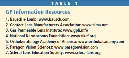 A large and increasing number of resources are available to assist with GP spherical and specialty lens designs. The Scleral Lens Education Society has educational programs and videos on scleral lens fitting and patient education. It also provides workshop programs all throughout the United States. The organization's officers are essentially a “Who's Who in GP Specialty Lenses,” including Drs. Greg DeNaeyer, Christine Sindt, Jason Jedlicka, Eef van der Worp, Muriel Schornack, and Mindy Toabe.