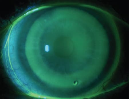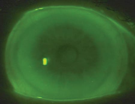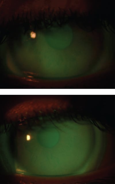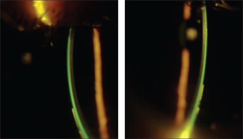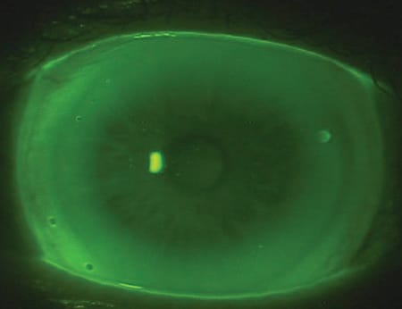 At the dispensing appointment, we applied the lenses and allowed them to settle. After settling, fluorescein was instilled into each eye and was allowed to circulate under the lenses. The fit was acceptable and the comfort was good (Figures 1 and 2). Distance vision was measured at 20/20 OD and 20/25 OS, with near vision at 20/25 OD and OS. The patient reported the comfort to be excellent with no real lens awareness. We dispensed the lenses with instruction for application, removal, care, and handling. She returned for a subsequent follow-up visit at which time she reported improved vision and no issues.