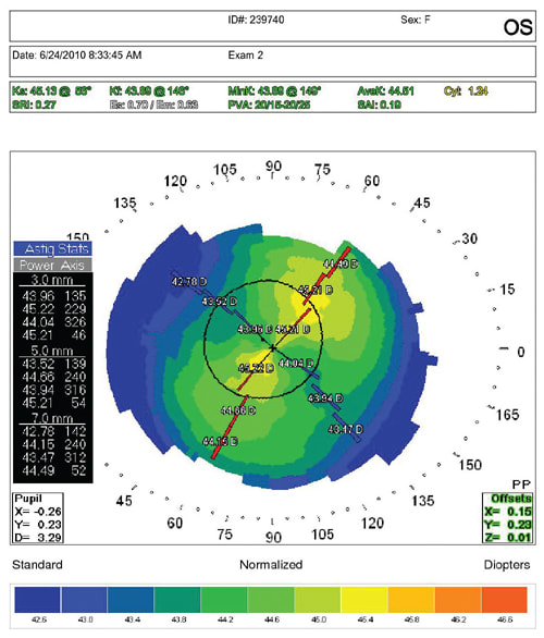 Her examination findings were refraction OD −9.75 −1.25 x 050, 20/20, add +2.50 J1 and OS −11.00 −1.75 x 145, 20/20, add +2.50 J1. Keratometry readings from topography (Figures 5 and 6) were OD 44.50/43.00 @ 44; OS 45.13/43.89 @ 146.