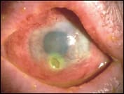 This 74-year-old patient presented to the VA Medical Center Eye Clinic complaining of bilateral mild-to-moderate ocular discomfort, which was more severe in the left eye. He had been treated previously with topical antibiotics for a "bacterial corneal ulcer." Visual acuities were 20/40– OD and OS. Biomicroscopy revealed severe bilateral blepharoconjunctivitis and meibomian gland dysfunction. Superficial corneal neovascularization extended 4mm to 5mm into both corneas, and corneal clarity was reduced on the visual axis OD and OS. In the left cornea, inferior to the visual axis was a 2mm by 3mm area of epithelial loss extending down to Bowman's layer.