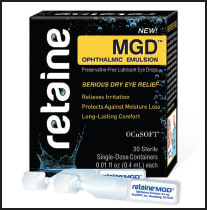 Retaine MGD is packaged in 30 singledose vials and will be the first product in a complete line of Retaine brand artificial tears. Special discount pricing is available to practitioners dispensing from their office, and patients may also order online directly at www.retainebrand .com. Call (800) 233-5469 or visit www.ocusoft.com/retainemgd.