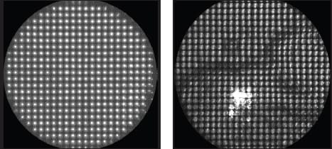 Figure 3. Aberrometry images showing a normal image (left) and a distorted image (right) due to tear film disruption. (Images obtained with the assistance of Jason Marsack, PhD.)