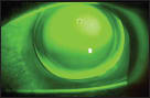 Figure 3 shows the final lens for the patient. We used the same base curve and diameter as the diagnostic lens, but ordered it with a “Grade 3 ACT,” or Asymmetrical Corneal Technology, Blanchard's name for a quadrant-specific peripheral curve system. In our case, we steepened the periphery at the bottom of the lens, “tucking” the edge in toward the cornea, to eliminate the edge stand-off. The patient noticed a resulting significant increase in lens comfort.