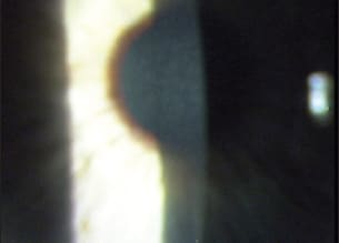 Biomicroscopy reveals gray opacities separated by clear lines arranged in a polygonal or mosaic pattern (Figure 1). The opacities are located in the central cornea and are positioned in the posterior corneal stroma, with some extending into the anterior third of the stroma. Although positioned centrally, they rarely affect vision. As with fleck dystrophy, patients have no other symptoms.