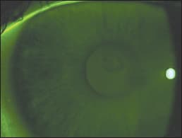 Presenting corrected visual acuities were: OD 20/25 and OS 20/20. Over-refraction did not further improve her vision. After removing her lenses, biomicroscopy revealed a perfectly circular area of negative staining positioned directly over the visual axis. No infiltrates or breaks in the epithelium were apparent. The anterior chambers were devoid of cells or flare, and there was no conjunctival injection.