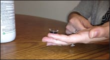 When applying the lens, the patient's face must be parallel to the ground, preferably over a mirror on a flat surface. With one hand, retract both lids, with the forefinger beneath the upper lashes and the thumb over the lower lashes. With the other hand, hold the suction cup to apply the lens. Once the lens is applied, the patient should release the lids before removing the suction cup. If a staff member is applying the lens, the patient can retract the upper lid while the staffer retracts the lower and applies the lens.