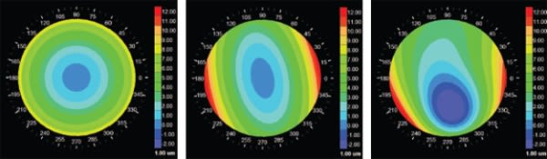 Figure 1 shows a series of wavefront error maps for an eye that has keratoconus. Figure 1a shows the portion of the wavefront error associated with defocus. This error is rotationally symmetrical and would be well corrected with a spherical soft contact lens. Figure 1b shows the addition of the astigmatic portion of the wavefront error. Although more complex, displaying mirror symmetry, this error would be well corrected with a spherocylindrical contact lens. Figure 1c shows the full wavefront error measured in this keratoconic eye, notably the prominent rotational asymmetry. Even after correcting the spherocylindrical errors, significant HOA (in this eye, coma) would remain and would continue to degrade retinal image quality.