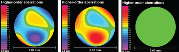 The series of images in Figure 2 simulates how HOA can be targeted in a contact lens, the compensating correction and theoretical residual HOA when the correction is applied to the eye. Although these lenses have been studied, access to them in the clinical environment remains limited. However, there are ongoing efforts to move the technology to the clinic.