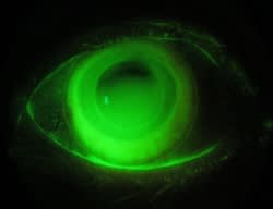 The corneal transplant of her right eye 11 years prior to the injury was for Fuchs' corneal dystrophy. Her transplant was clear, but she was able to achieve only 20/100 best-corrected visual acuity with a glasses prescription secondary to corneal irregularity. She was successfully fit with a scleral contact lens that improved her visual acuity to 20/30 (Figure 2).