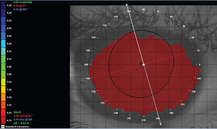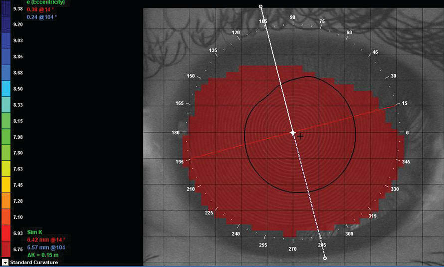 A 21-year-old female teacher presented with manifest refraction of +14.00 –0.75DC x 90 OD and OS. Best-corrected visual acuity was recorded as 20/80. For both eyes, axial length was 15.4mm, anterior chamber depth was 2.70mm, and intraocular pressure (IOP; Goldmann applanation tonometry) was 12 mmHg. Gonioscopy revealed a convex iris configuration in both eyes, and retinal examination showed hyperopic discs. Automated keratometry readings were 51.87 @ 104/52.62 @ 14 OD and 51.75 @ 94/52.25 @ 4 OS. Horizontal visible iris diameter was 10.5mm OD and OS, and vertical visible iris diameters were 9.5mm OD and 10mm OS. Palpebral fissure height was 10mm in both eyes. Simulated K readings were 52.73 (6.40mm) @ 16/52.40 (6.44mm) @ 106 OD and 52.57 (6.42mm) @ 14/51.36 (6.57mm) @ 104 OS (Figure 1).