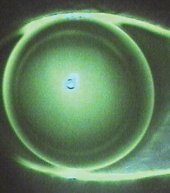 Our initial GP lenses were fit on-K with a small diameter (8.00mm) OD and OS. Ultimately, an optimal interpalpebral fit was achieved with a steep base curve and a small-diameter lenticular design. The final GP lenses had parameters of 6.2mm base curve, 8.0mm overall diameter (OAD), +16.50DS, and oxygen permeability (Dk) of 30 OD and OS. At lens dispensing, her best-corrected visual acuity with these GP lenses was 20/80 OD and OS. The lenses demonstrated adequate movement, with good pupillary coverage in both eyes. The right lens exhibited a diffuse fluorescein pattern with adequate edge clearance, and the left lens demonstrated slight central fluorescein pooling with adequate edge clearance (Figure 2). The patient is currently enjoying her vision with the GP lenses, without any complications.