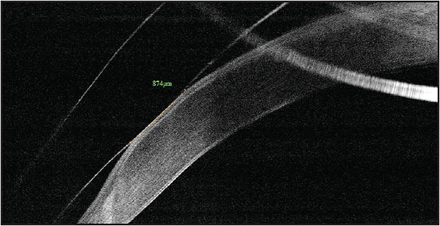 Figure 2. OCT image of the periphery of a scleral lens on a patient who has pellucid marginal degeneration. The lens contacts the cornea over an area 0.87mm long. These types of measurements help guide decision-making in modifying the lens fit and were impossible before the advent of this technology.