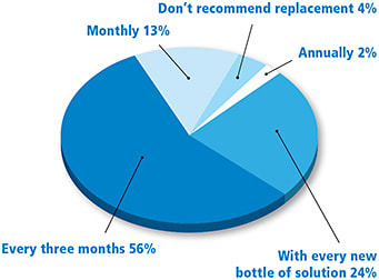 The majority of attendees indicated that they recommend patients replace their contact lens case every three months (56%) (Figure 2). The second most common response (24%) was to recommend case replacement with every new bottle of disinfecting solution. Only 13 percent recommended monthly case replacement. Very few (4% and 2%, respectively) indicated that they don’t recommend a replacement schedule or that they recommend annual case replacement.