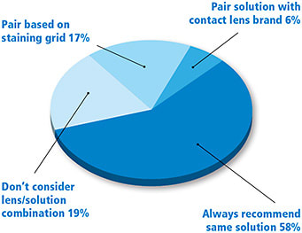 There is evidence that some care solution-lens material combinations are more likely to result in corneal staining, discomfort, and corneal inflammatory events (Carnt et al, 2009), and the Andrasko Staining Grid (www.staininggrid.com) shows that some contact lens solution and lens material combinations are more likely to result in corneal staining after two hours. In spite of this, the majority of respondents prescribed the same care solution regardless of material (Figure 4). Only 17% of the respondents use the Andrasko Staining Grid when deciding what care regimen to use for a specific lens material. It is important to note that the FDA specifically states that contact lens care solutions can cause serious problems—including eye infections—if not used correctly (FDA, 2014).