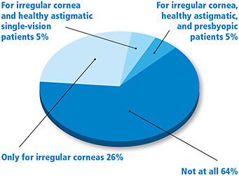 When polled about the reason for fitting scleral lenses, 64% of audience members reported not fitting scleral lenses at all. Approximately one-fourth fit scleral lenses for irregular corneas only (Figure 5). Very few respondents were fitting sclerals for irregular corneas and healthy astigmatic single-vision patients (5%). Likewise, very few respondents were fitting for irregular corneas and healthy astigmatic presbyopic patients (5%).