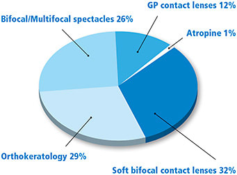 Bifocal or multifocal spectacles, orthokeratology, and soft bifocal contact lenses were the three most-prescribed types of myopia control by polled practitioners (Figure 1). While orthokeratology (Charm and Cho, 2013; Chen and Cho, 2012; Cho and Cheung, 2012; Cho et al, 2005; and others. Full list available at www.clspectrum.com/references.) and soft bifocal contact lenses (Aller and Wildsoet, 2006; Anstice and Phillips, 2011; Lam et al, 2014; Sankaridurg et al, 2011; and others) have been found to slow the progression of myopia in children, soft multifocal or bifocal spectacles have never slowed the progression of myopia by more than 34% (Berntsen et al, 2012; Cheng et al, 2014; Correction of Myopia Evaluation Trial [COMET] 2 Study Group for the Pediatric Eye Disease Investigator Group, 2011; Edwards et al, 2002; and others), even in esophoric patients who have high accommodative lag and are most expected to benefit from multifocals (Berntsen et al, 2012; COMET 2 Study Group, 2011; Fulk et al, 2000).