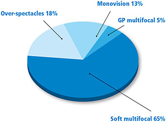Audience members primarily prefer to fit soft multifocal contact lenses on presbyopic patients (Figure 6). This reflects the gradual transition from monovision to multifocals as the practitioner preference.