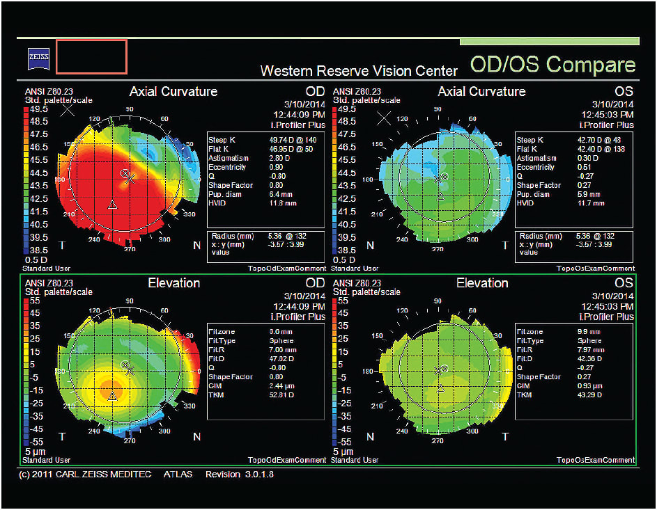 This case is an example of a patient who is simply GP lens intolerant. Like the patient in Case 1, this patient suffered from reduced wear of his contact lenses, interrupted wear, loss of work, and inability to depend upon contact lens wear for his correction. His topography map also showed forme fruste keratoconus, with a progressively steepening right topography over time (Figure 2). This patient’s previous glasses had a prescription of OD +0.75 –4.00 x 055, 20/400 and OS +0.50 –1.00 x 100, 20/20.