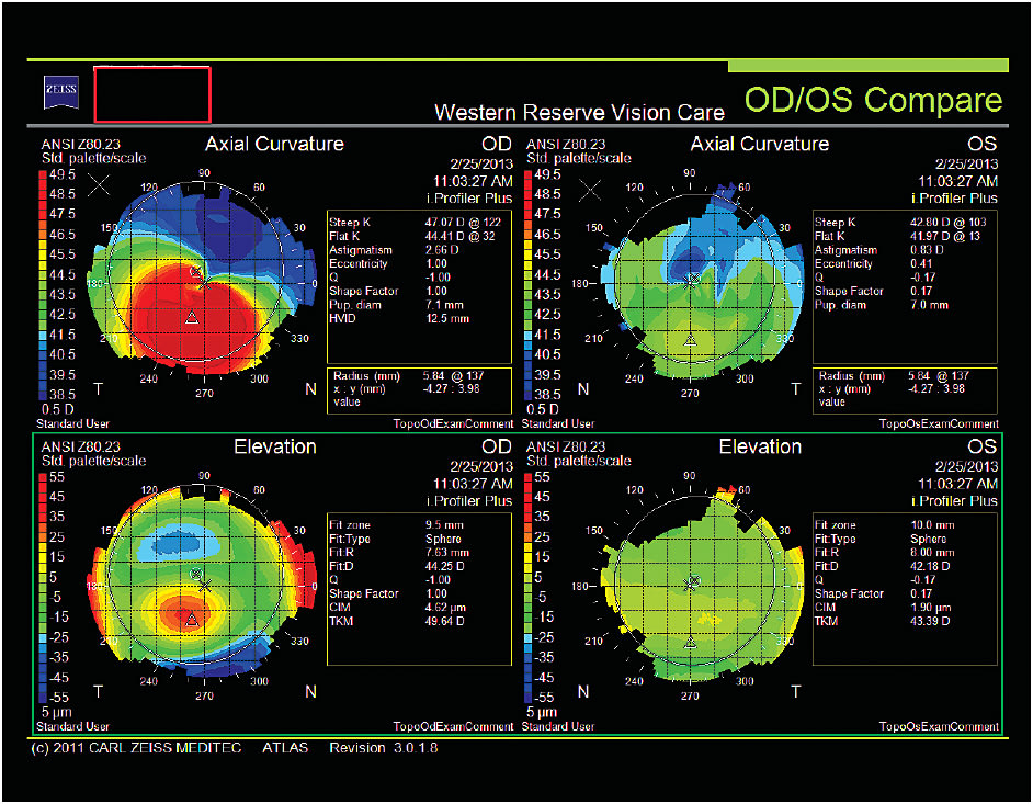 This case is an example of a keratoconus patient who was wearing soft toric lenses, but was undercorrected. This patient had severe keratoconus in the right eye and forme fruste keratoconus in the left eye. He was currently wearing a soft toric lens that was comfortable, but was under-correcting the cylinder and not correcting the irregular astigmatism. His contact lenses had a back-surface toric design with –3.25D cylinder correction and were manufactured in methafilcon A (55% water content) material.