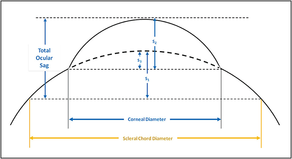 The theoretical ocular sagittal height can be determined mathematically using the formula: Total Ocular Sag = S1 + S2 – S3 (Figure 2), in which S1 and S2 are the corneal and scleral sagittal heights, respectively. The theoretical ocular sagittal height can be calculated using the equation: