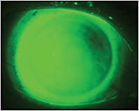 The first task in assessing the fit of any scleral lens is to evaluate the fluorescein pattern over the central optical zone. In each case, regardless of how irregular, tilted, or protruding the cornea is, the aims are to completely vault the cornea and limbus so as not to cause bearing. And, especially in the case of ocular surface conditions, to form a tear reservoir between the lens and cornea for further protection and relief from symptoms. If any touch is evident, the lens depth should be increased by approximately 300 to 400 microns.