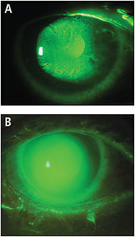 Figure 6. A case example of a GVHD patient who has severe punctate erosions (A); same patient with a properly fit scleral contact lens achieving 20/20 vision (B).