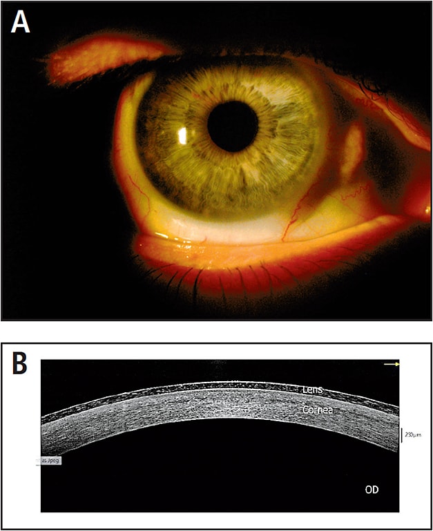 Figure 4. LASIK-induced iatrogenic corneal ectasia fitted with regular soft toric lens in the right eye (A). OCT cross-section over this lens (B).