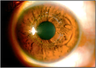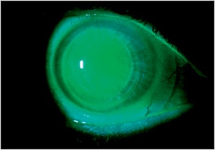 Figure 6. Large-diameter corneal GP fitted over ICRSs implanted for treatment of keratoconus in the left eye. Note the area of clearance over the ICRSs.